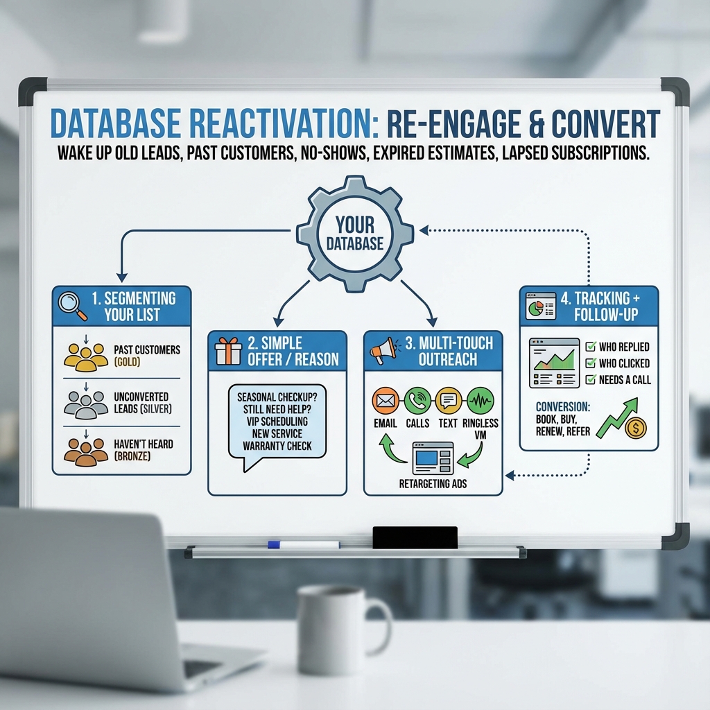 Our database reactivation helps businesses turn old, inactive contacts into new revenue—without spending more on ads. Over time, every business builds a database of past leads, customers, and missed opportunities that simply go quiet. Database reactivation uses automated SMS, email, voicemail, and AI follow-ups to reconnect with those contacts in a timely, personal way.